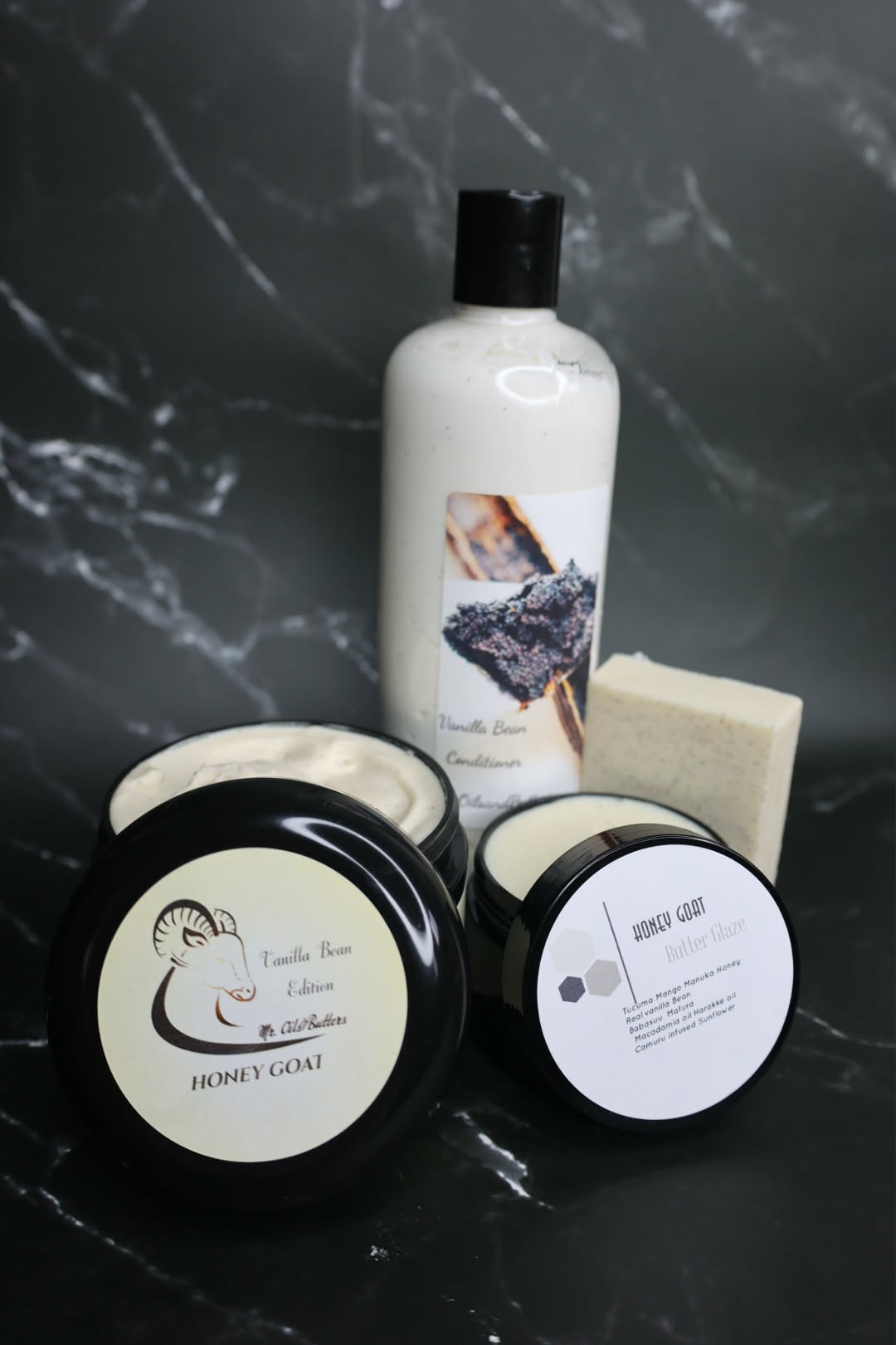 Introducing our new HoneyGoat Vanilla bean moisturizing Shampoo bar. Of course its smells great and is folded with waygu tallow and our trinity oil to provide lasting softness and introductory moisture to hair regimen. The bar also has Mango Butter, illipe Butter which acts as a cleanser and give the bar some structure. Honey and Vanilla bean.